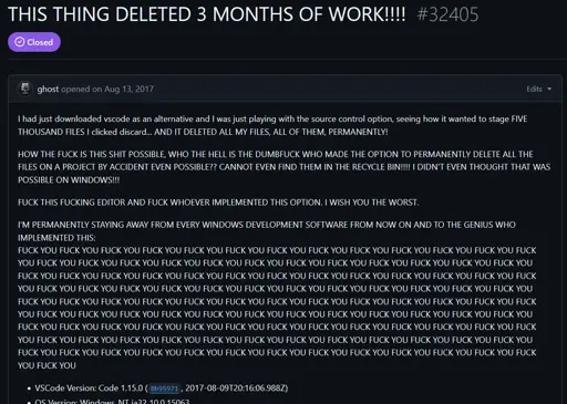 It’s so fucking infuriating that so many devs act like this. “This should’ve been obvious!” Fuck off, that’s an unhelpful statement. “You should’ve been using version control! No backup, no sympathy!” Fuck off, they were literally trying to begin using version control for backups.