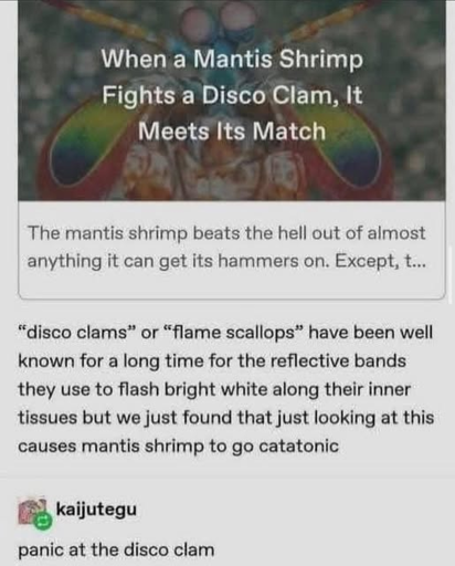 cm0002@suppo.fi to Funny@sh.itjust.works · 9 days agoWhen a mantis shrimp fights a disco clamsuppo.fiimagemessage-square20linkfedilinkarrow-up1341arrow-down13