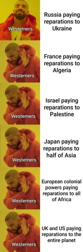 bubblybubbles@lemmy.ml to Memes@lemmy.ml · 13 days agoWeird, the only country westoids demands reparations from is the one who stands against western imperialismlemmy.mlimagemessage-square27linkfedilinkarrow-up1156arrow-down167