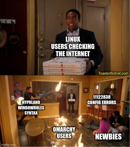 ToasterBotnet - Productivity and Memes@piefed.social to linuxmemes@lemmy.worldEnglish · 6 days agoHyprland Updatemedia.piefed.socialimagemessage-square76linkfedilinkarrow-up1329arrow-down112