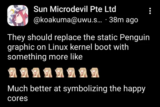 minus-squareBlueSquid0741@lemmy.sdf.orglinkfedilinkarrow-up6·6 days agoMy first impression of this was trying to work out when and why would we see Tux during boot