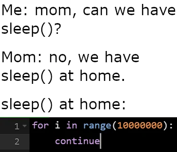 JPDev@programming.dev to Programmer Humor@programming.dev · 2 years agoSleep() at homeprogramming.devimagemessage-square4linkfedilinkarrow-up11arrow-down10