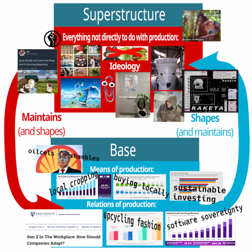 I think the meme would be better if you actually filled the sections with what the original image shows, like actual means of production, relations, etc. Just my 2 cents!