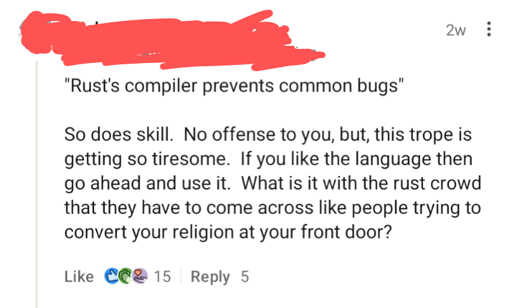 “Rust’s compiler prevents common bugs” So does skill. No offense to you, but, this trope is getting so tiresome. If you like the language then go ahead and use it. What is it with the rust crowd that they have to come acrosslike people trying to convert your religion at your front door?