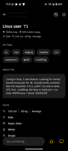 This tracks for how a lot of people use the app, but depending on where you are you can also have some fairly normal (for a dating site) conversations with people as well. I spent a couple months on Grindr despite not being interested in hookups, since it’s a decent way to meet other trans folk in my area. My inbox was mostly dick pics but I also met some amazing people I’m still with several years later!