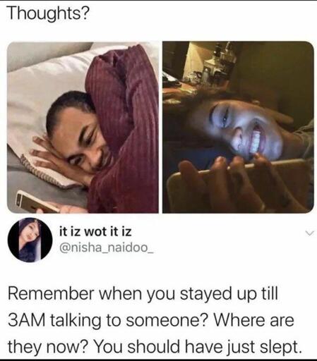 Most of those late night exchanges were once happy memories. Some of them still ongoing :) quality chat is worth sacrificing sleep for once in a while.