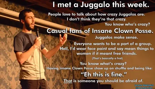 Reminds me of a quote I heard from somewhere a while ago: “I’ve never met a casual Slayer fan. I’ve only met the fan with Slayer carved into his chest.” Seems like that can apply to ICP fans too except with Hatchetman tattoos.