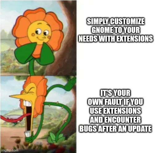 Ah yes, the real good faith argument here is saying you can do nothing to customize GNOME because sometimes extensions break. Great point.