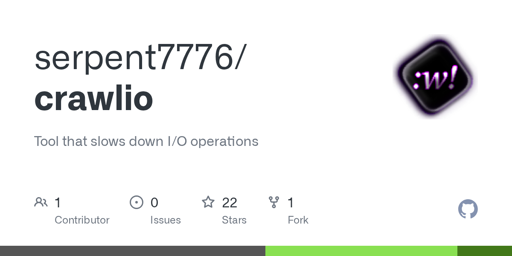 Crawlio is a simple C tool that slows down I/O operations by adding a specified amount of time to each I/O call. It uses LD_PRELOAD.