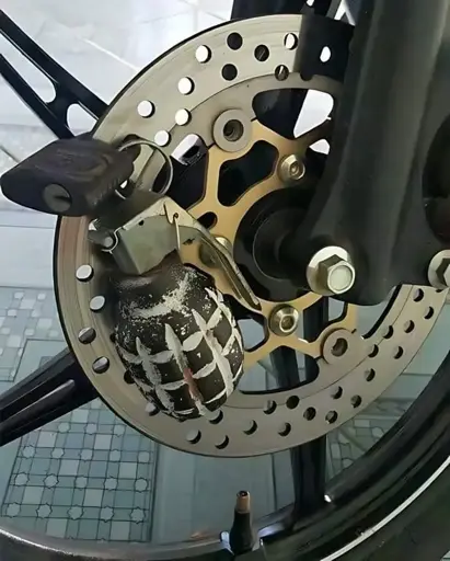 This is on the disc brake, so the grenade would drop as soon as you ride away since it would not fit between the frame and the wheel, dropping the pin and exploding the grenade probably before they have a chance to run.