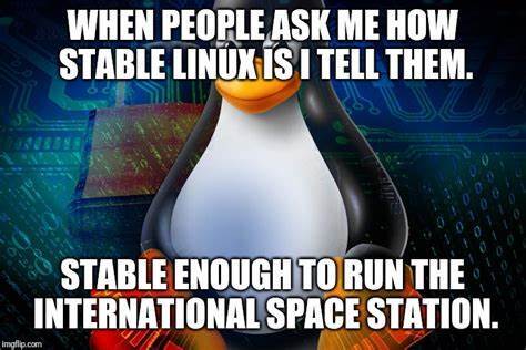 Linuxmemed@lemmy.world to linuxmemes@lemmy.worldEnglish · 2 years agoISS much stablelemmy.worldimagemessage-square0linkfedilinkarrow-up11arrow-down10