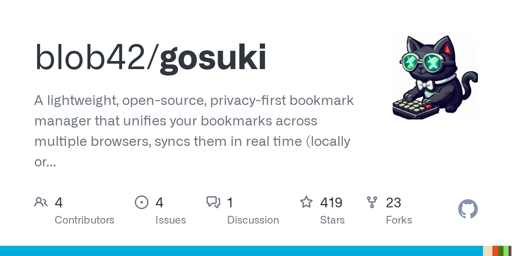 arrow-up13arrow-down1external-linkGosuki: a cloudless, real time, multi-browser, extension-free bookmark manager with multi-device syncplus-squaregithub.comblob42@lemmy.ml to Self Hosted - Self-hosting your services.@lemmy.ml · edit-24 months agomessage-square0linkfedilink