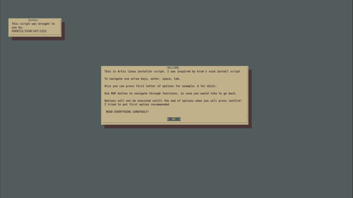 cm0002@lemmings.world to Linux@programming.dev · 1 day agoTUI Artix Linux Install scriptplus-squarelemmy.mlimagemessage-square2linkfedilinkarrow-up128arrow-down11