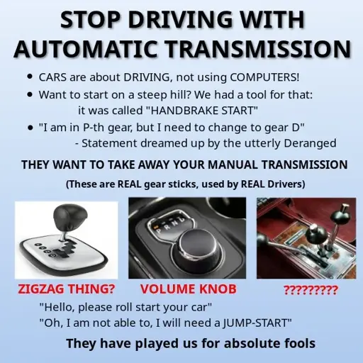 darcy@sh.itjust.works to Memes@lemmy.mlEnglish · 2 years agoI LOVE MANUAL TRANSMISSIONsh.itjust.worksimagemessage-square0linkfedilinkarrow-up11arrow-down10
